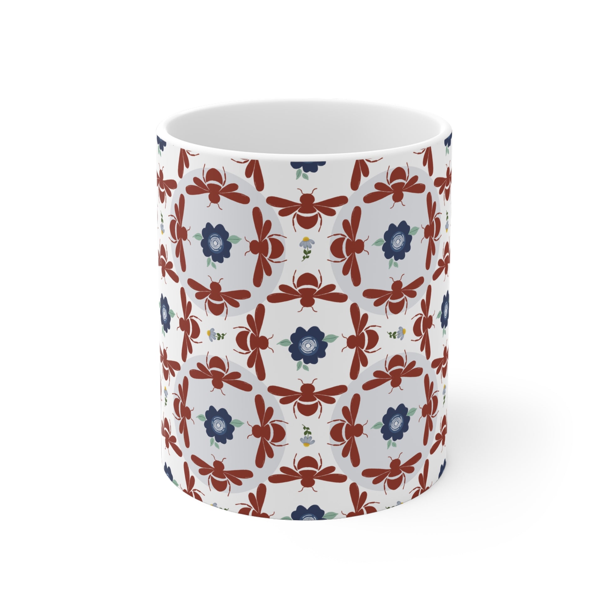 Geometrical Floral and Bees Ceramic Mug in Dark-Reddish Brown and Blue