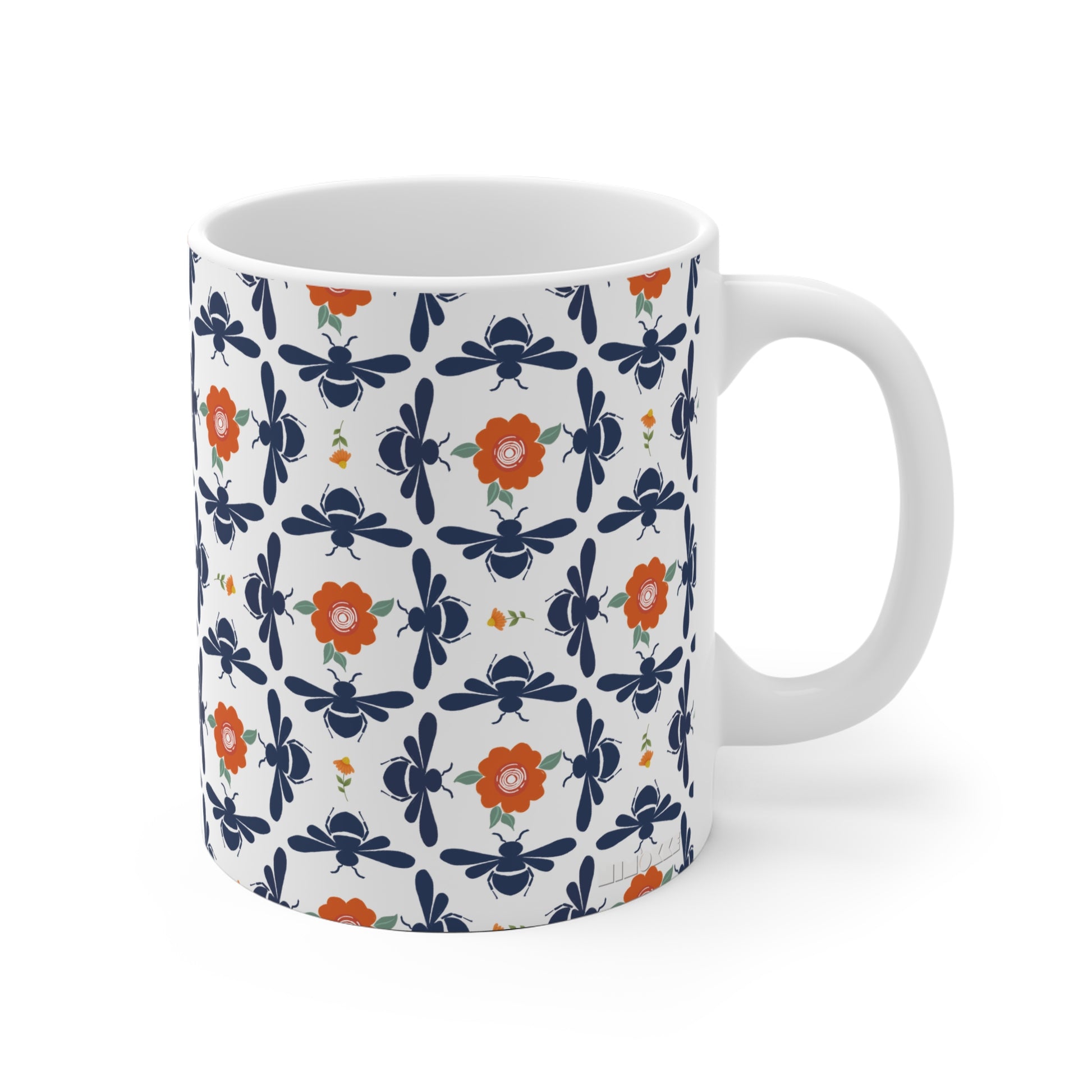 Coffee Cup or Tea Mug with Blue Bees and Orange Flowers