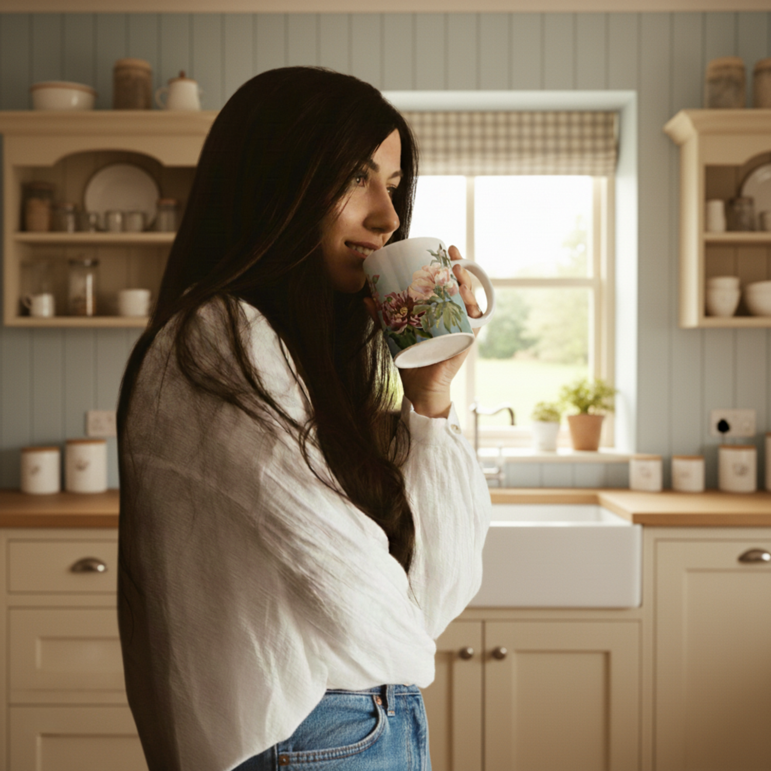 Een frisse ochtend met je eerste kop koffie in een mok vol bloemenpracht, of een knus avondmoment met warme chocolademelk in een vogelmotief dat doet denken aan stille tuinochtenden. Onze mokken mogen gerust in de magnetron en de vaatwasser – ze zijn praktisch én mooi tegelijk. Het ruime oor ligt prettig in de hand en het formaat van 325 ml is precies goed voor koffie, thee, latte of een zachte kruidenthee.